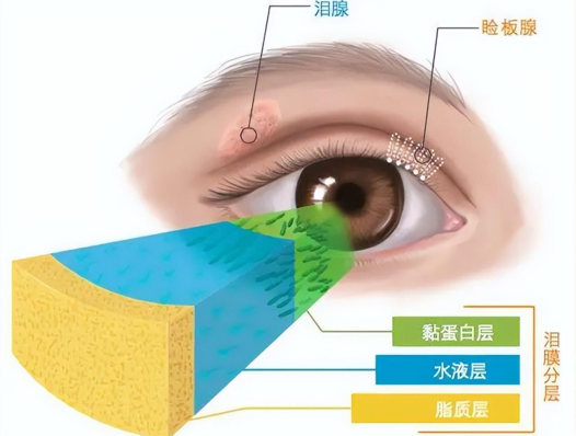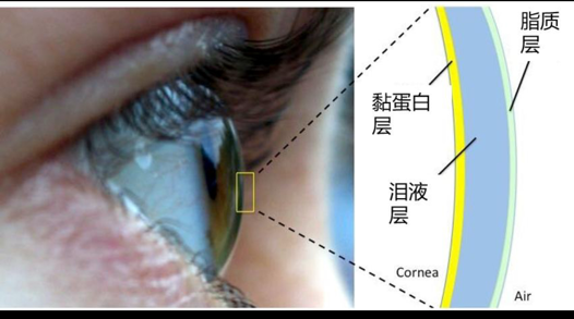 泪膜是非常薄的,在角膜前泪膜的厚度只有6~10毫微米,但就是这样薄的泪膜还可以自内向外分为三层:黏蛋白层、水液层和脂质层。黏液层厚度只有0.02~0.05毫微米;水液层是泪膜的主体,在角膜前平均厚度6~10毫微米,占泪膜厚度的98%,它能保持角膜、结膜的湿润,行使泪液功能的主要成分;脂质层厚度在0.05~0.5毫微米之间;它的作用是防止水样的泪液直接与空气接触而减少蒸发。