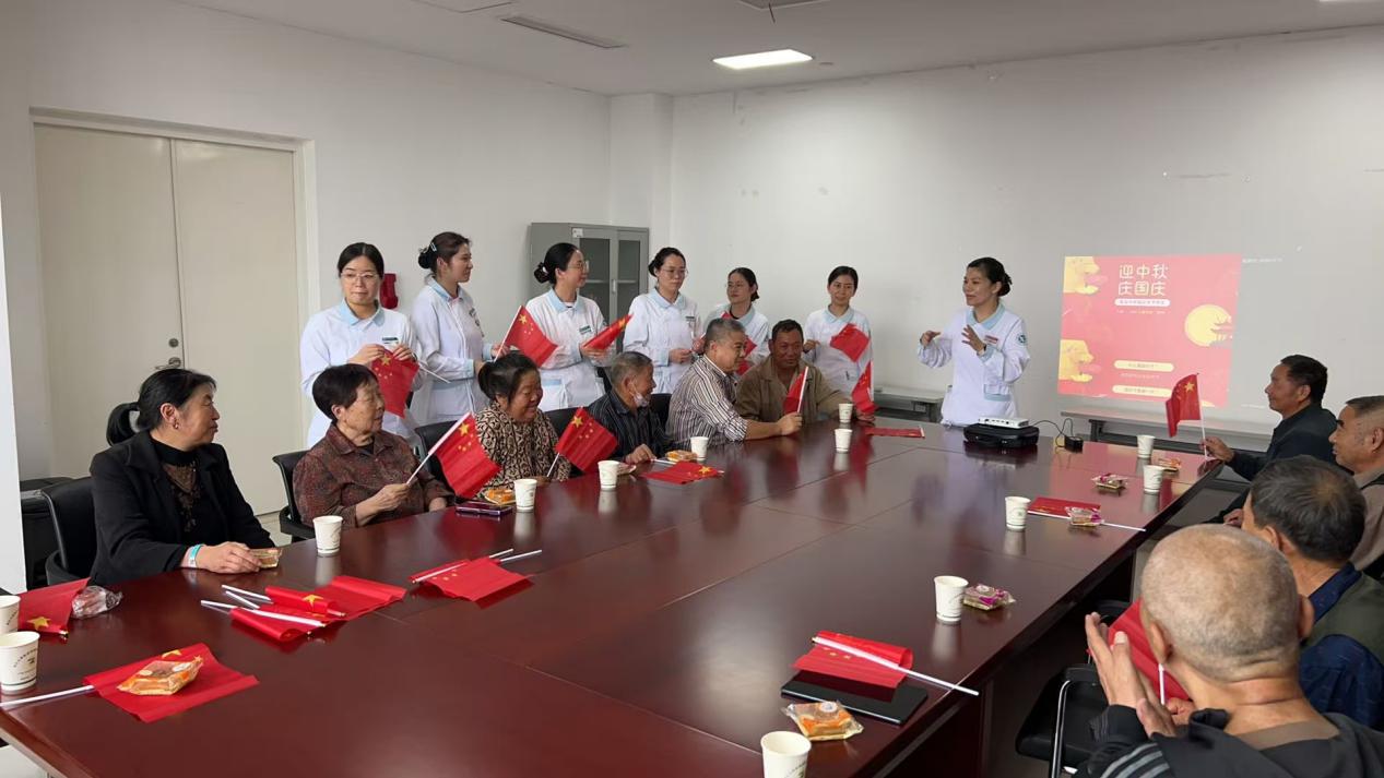 "我爱我的祖国、一刻也不能分割!"随着钟芳、龚小艳、袁曼护士长带领下,医患围坐,歌声与笑声此起彼伏,这个呼吸科病房里的双节工休会,让健康教育与爱国情怀在温暖的对话中悄然流淌。“我和我的祖国,一刻也不能分割……”中秋国庆双节前夕,一场特别的病友会上,白衣天使与患者们手执五星红旗,齐声高歌。歌声嘹亮中,不少患者眼中闪着泪光,他们中有的是年迈的肺炎老人,有的是正值壮年的哮喘患者,此刻却都化身为祖国最虔诚的歌唱者。全体一起歌唱《我爱我的祖国》响彻示教室。没有华丽的舞台,没有专业的指挥,但当旋律响起时,所有人的目光都自发聚焦在前方的小国旗上,每一面都系着写满祝福的红色丝带的国旗上。