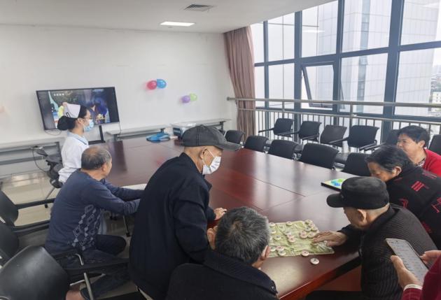 走进活动室,明媚的阳光透过明亮的窗户洒满整个空间,映照着一张宽大的深红色会议桌。桌旁,几位白发苍苍的患者正全神贯注地围坐对弈,棋子在棋盘上落下清脆的声响。一位老人俯身沉思,步步为营;另一位则气定神闲,从容应对。旁边,身着红色上衣的女士双臂交叉,面带微笑地观战,而一位“白衣天使”也俯身靠近,口罩上方露出的双眼满含关切,与老人们一同沉浸在“棋”乐无穷之中。窗外是城市的繁华景象,窗内是方寸棋盘上的思维碰撞与温情流淌,构成了一道独特而动人的风景线。