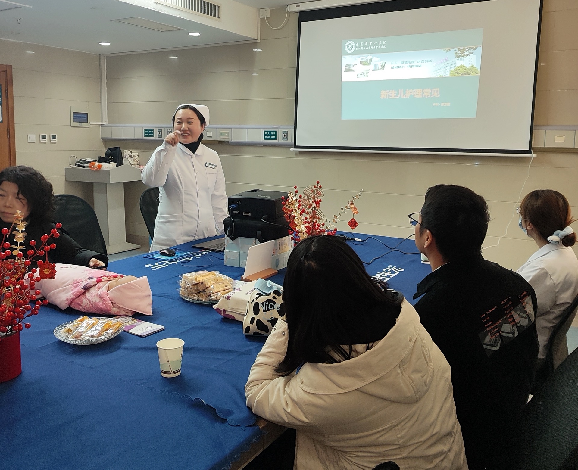 2026年1月24日,星期六,我院产科孕妇学校内暖意融融,一场以“迎接新生命,做智慧父母”为主题的健康教育讲座暨互动实践活动正如火如荼地进行。本次活动旨在为准爸爸准妈妈们提供从孕期到新生儿期的全方位科学指导,内容涵盖母乳喂养、新生儿护理、常见问题应对及趣味手工制作,现场气氛热烈,宝爸宝妈们兴致高昂,收获颇丰。