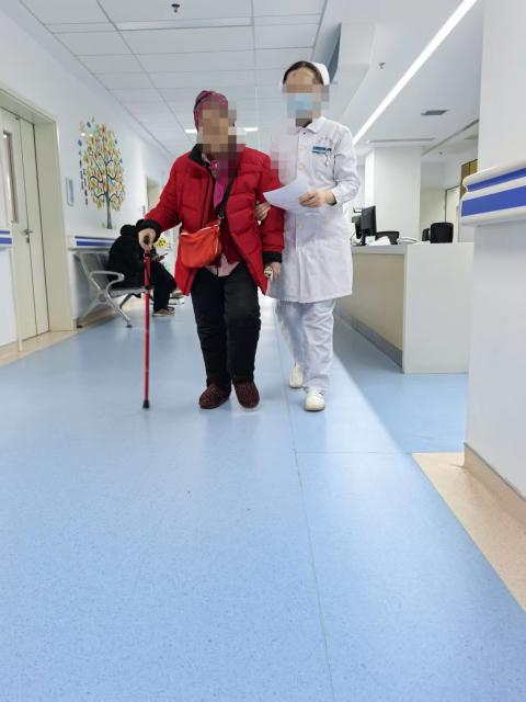 画面中,这位穿着红色外套的患者是正依靠着拐杖缓缓前行,身旁的护士紧紧搀扶着她的手臂,目光里满是专注与温柔。