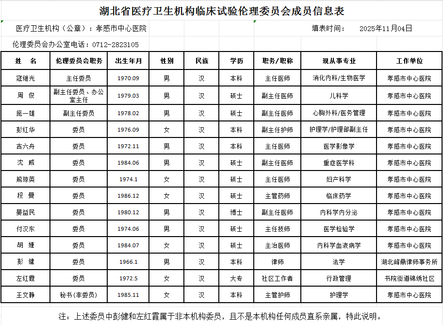 湖北省医疗卫生机构临床试验伦理委员会成员信息表