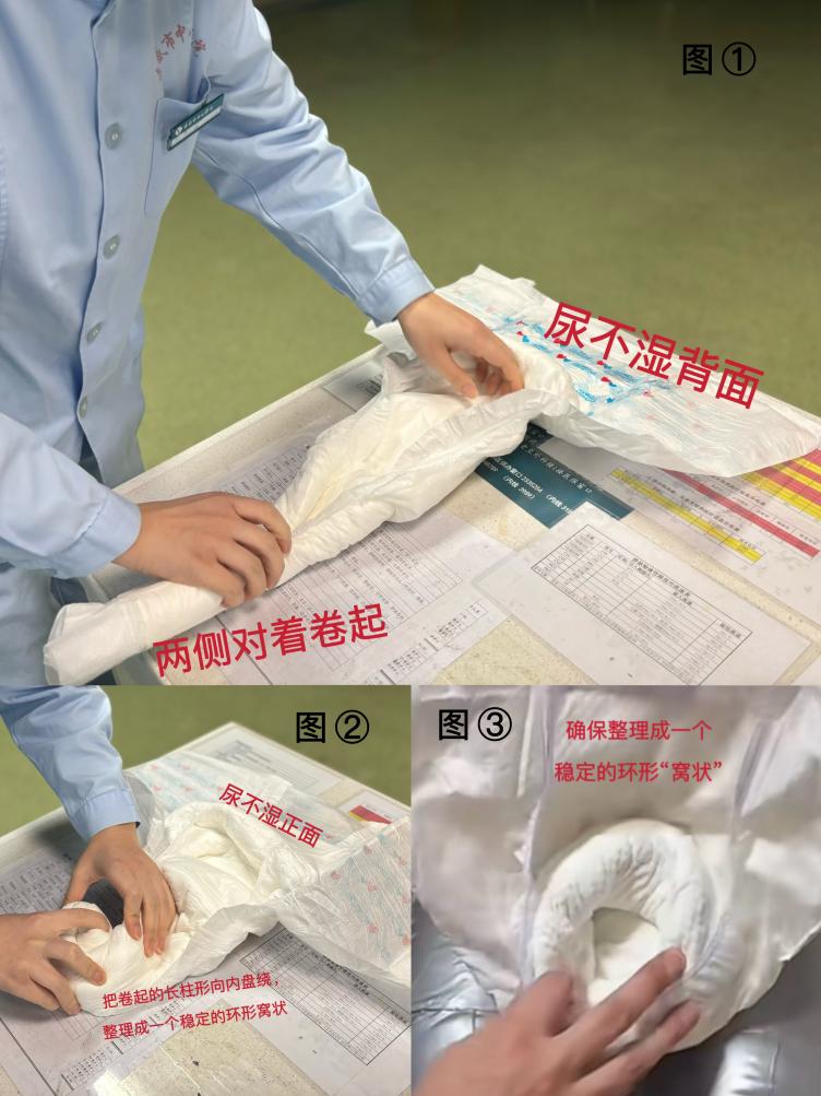2.塑形成窝:将纸尿裤翻至正面,把卷起的长柱形向内盘绕,整理成一个稳定的环形“窝状”,确保其能稳固承托排尿部位。