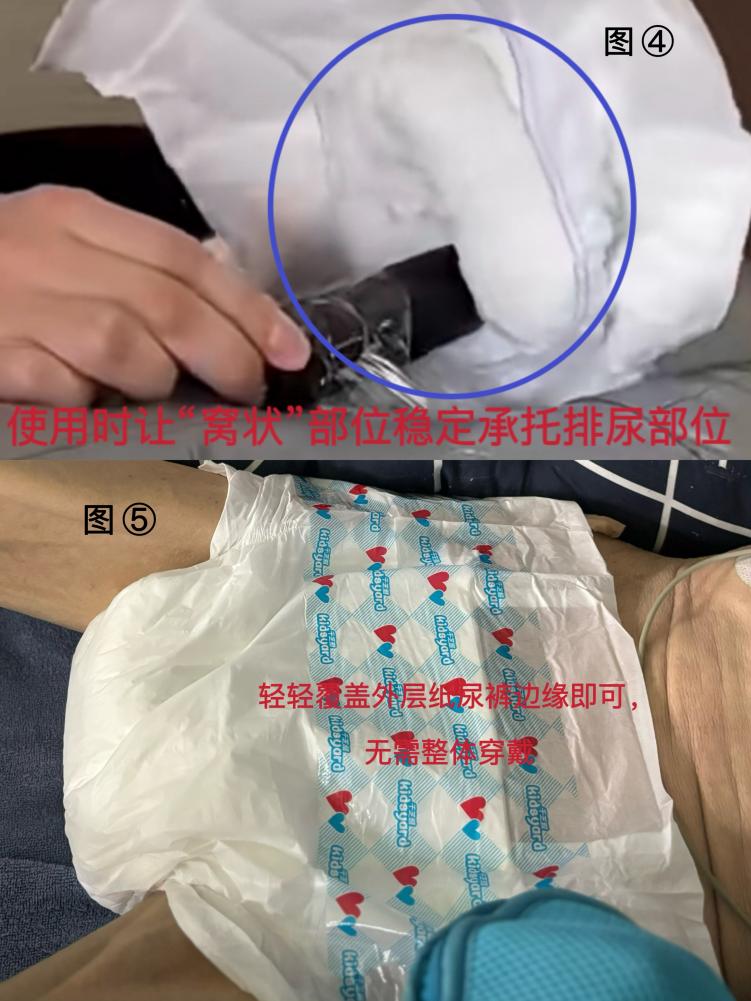 3.临床应用:将塑形好的“小窝”精准对准患者排尿部位,仅覆盖局部区域,无需整体穿戴,轻轻覆盖外层纸尿裤边缘即可。