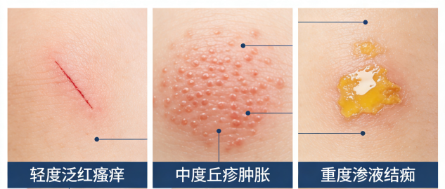 - 重度:红肿刺痛、丘疹成水疱,渗液结痂伴灼热感,可合并眼唇肿胀。