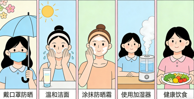 1.隔绝过敏原:外出戴口罩/帽子/墨镜、穿长袖,避开10:00-16:00花粉高峰;回家清洁皮肤,每周换床品,用空气净化器/除螨仪,花粉季关门窗;